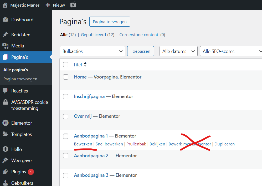 2. Houd je muis op de pagina die je wil verbergen en klik op Bewerken (klik niet op Bewerken met Elementor)